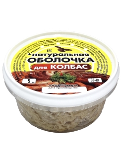 Оболочка для домашних колбас 38-40 мм, 5 метров, кат.А (натуральные черева говяжьи) - это натуральная оболочка калибром (диаметром) 38-40 мм для изготовления колбасных изделий в домашних условиях. Говяжья оболочка отличается эластичностью и является самым крепким видом натуральной оболочки. Используется, как правило, для приготовления сыровяленых колбас, купат, сарделек, Краковской колбасы. Фаршеемкость 600-650 грамм на метр. Длина оболочки 5 метров рассчитана примерно на 3-4 кг готового продукта. Производится из сырья, прошедшего ветеринарно-санитарную экспертизу. Является натуральным съедобным продуктом, который полностью переваривается организмом. Хорошая паро- и дымопроницаемость позволяют использовать череву для приготовления любых видов колбас.